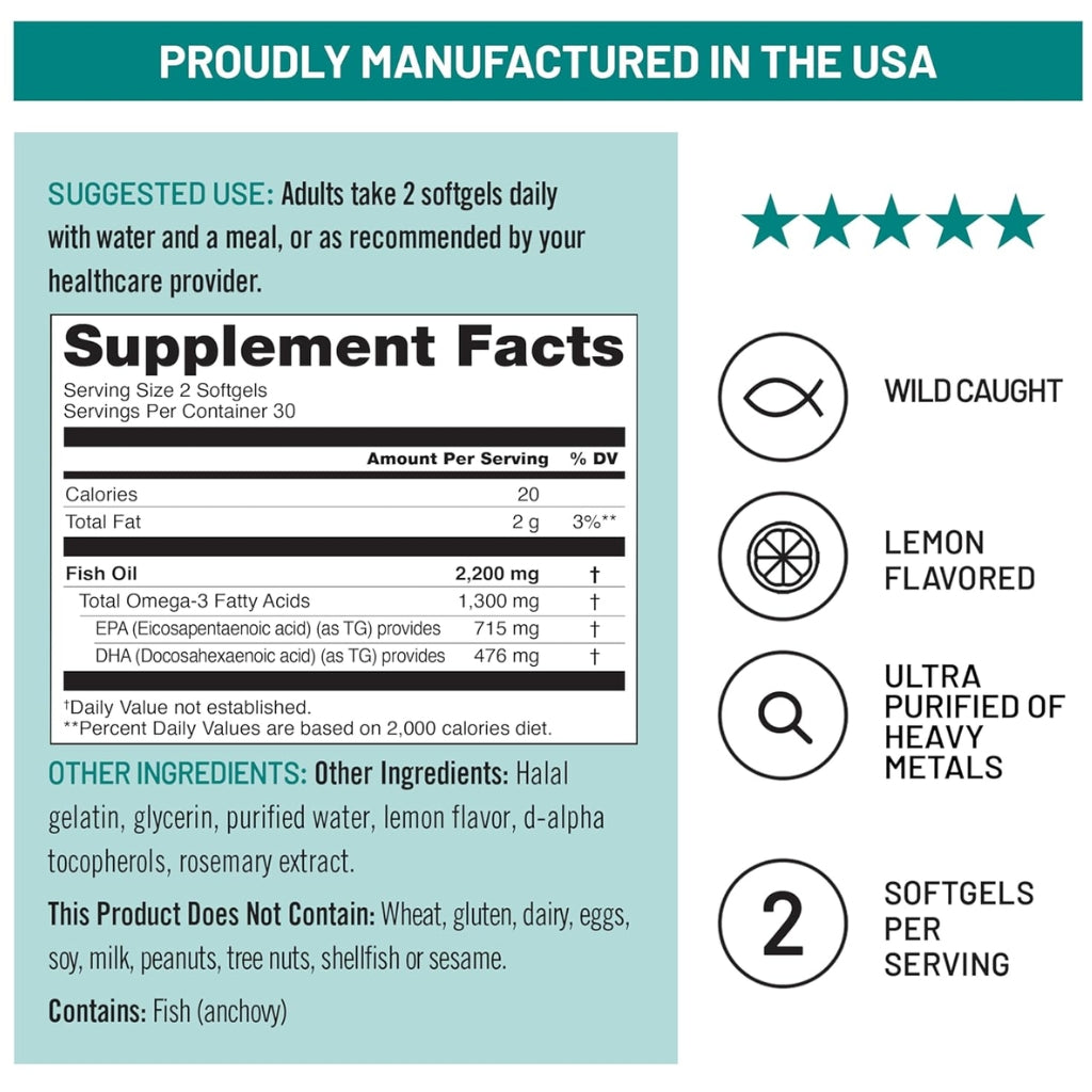 Apoyo cerebral y cardíaco: esta fórmula de alta absorción contiene 1300 mg de omega-3 beneficiosos - 2200 mg de aceite de pescado, 715 mg de EPA y 476 mg de DHA (por 2 cápsulas blandas) para apoyar la salud general del corazón, el cerebro y los ojos. *
